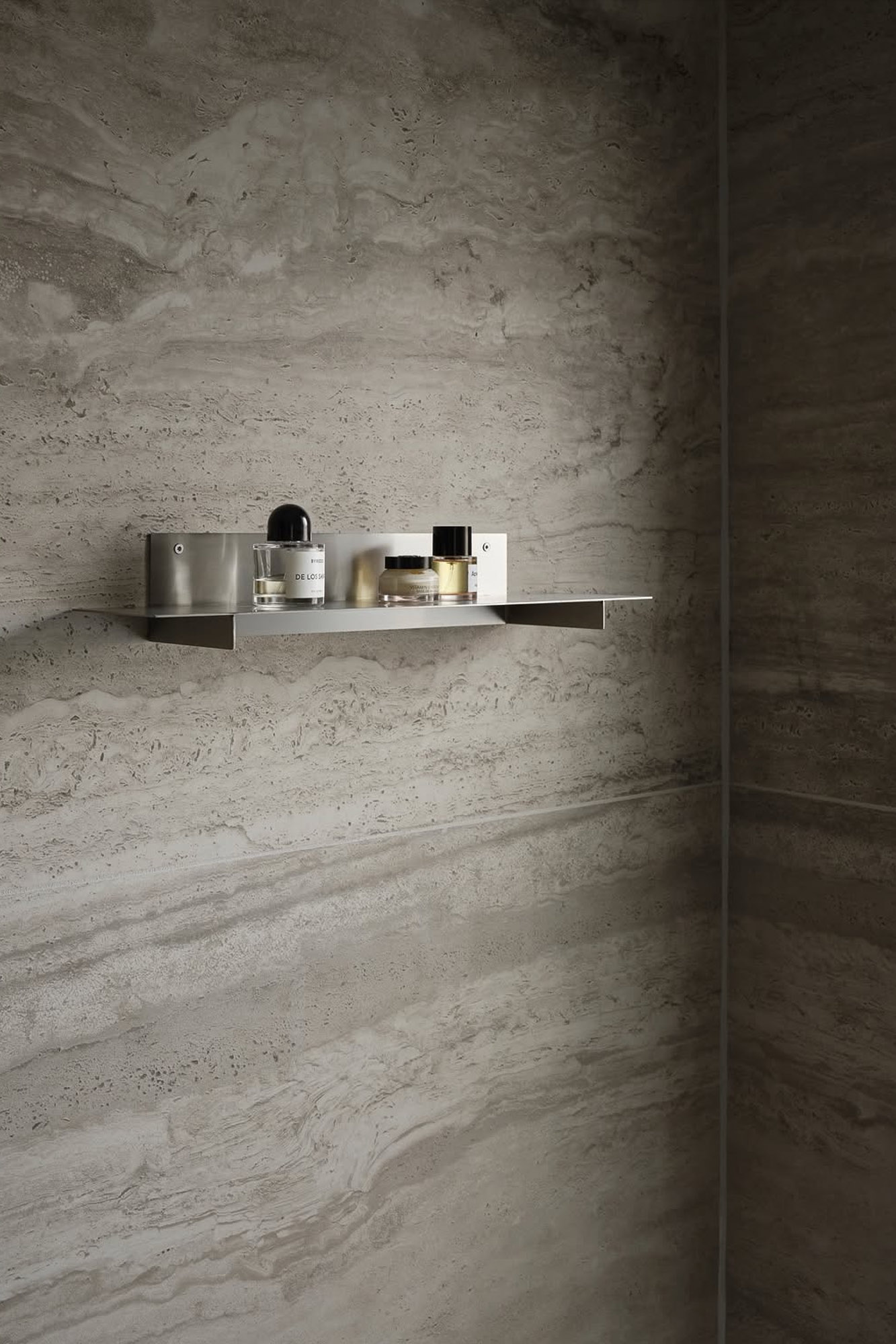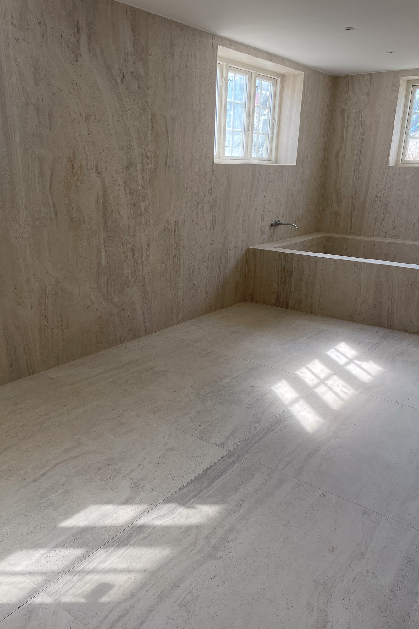 Travertinfliser kommer i mange forskellige former og udseende. Der er den ægte natursten, og der er den keramiske flise med travertin-look. De kommer begge i forskellige farver, størrelser og finishes. Her ser du den keramiske flisen Navona, Bone Vein, under installation hos en kunde.